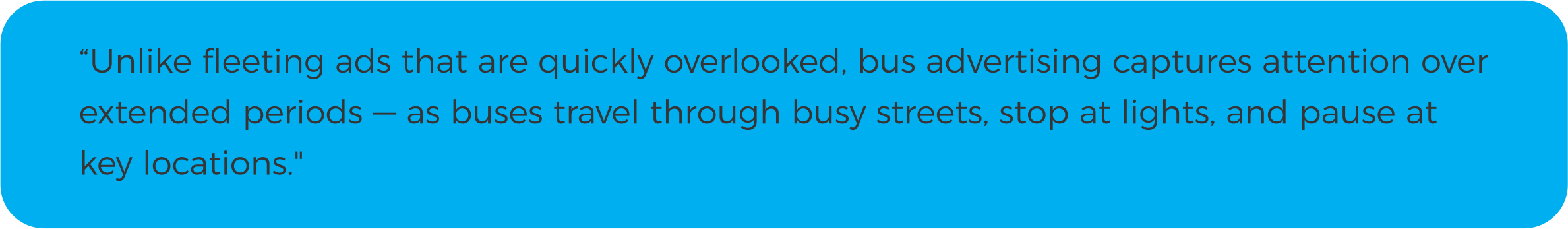 Bus advertising is also an outdoor advertising medium that cannot be ad-blocked, muted, or skipped. It reaches people in the real world, where purchase decisions are often made — at the shops, on the commute, or heading out for the weekend.